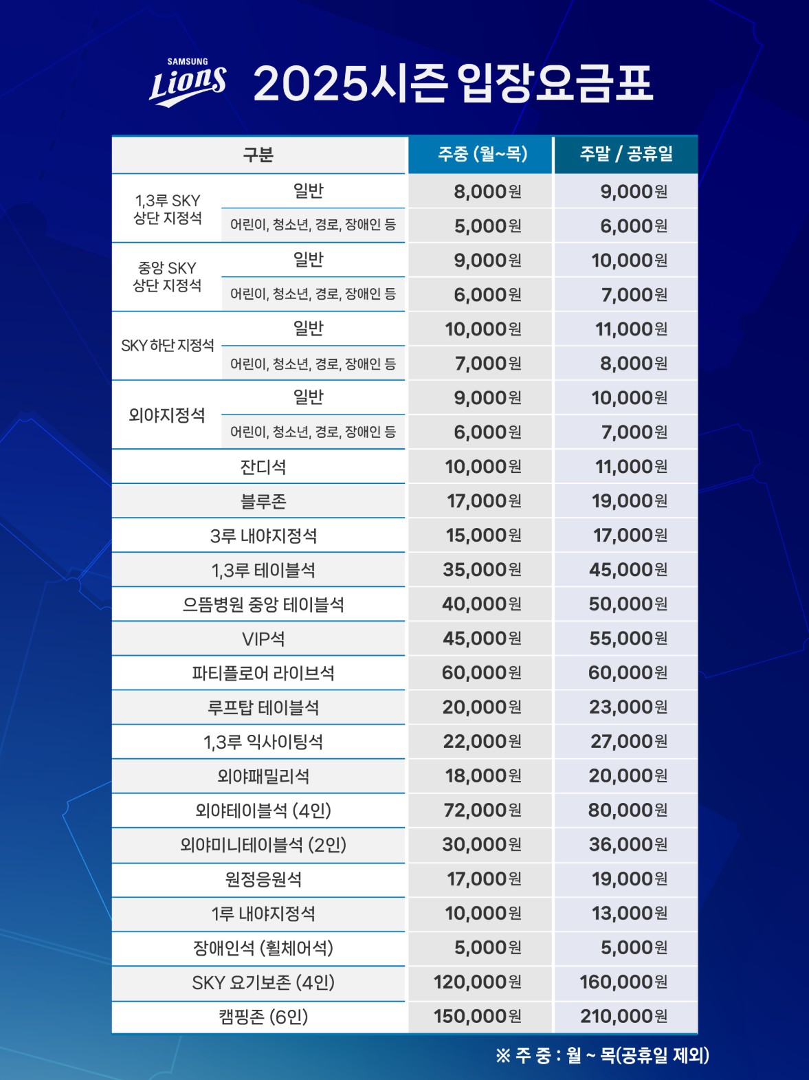- 예매처: 삼성 라이온즈 공식 홈페이지 (블루멤버십 선예매) 및 티켓링크